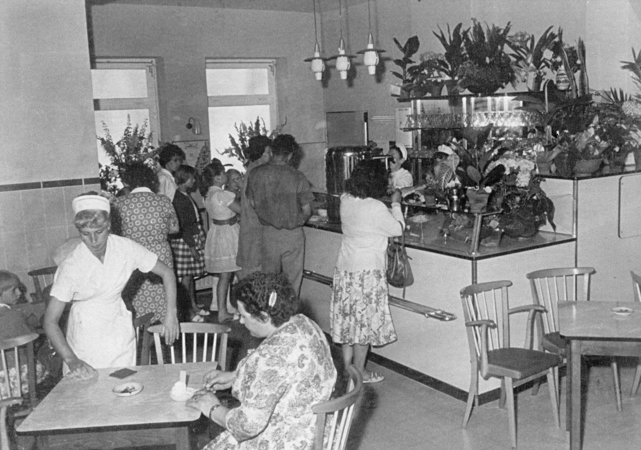 Hochmodern in Technik und Ausstattung präsentiert sich Eis Meyer stolz seinen Gästen im pieckfeinen Laden. Nach einjähriger Bauzeit feiert Eis Meyer 1954 die Eröffnung seines neuen Eiscafé im Hasseldiecksdammer Weg.