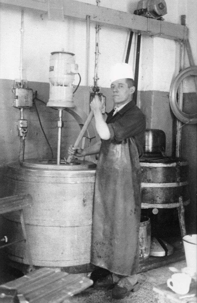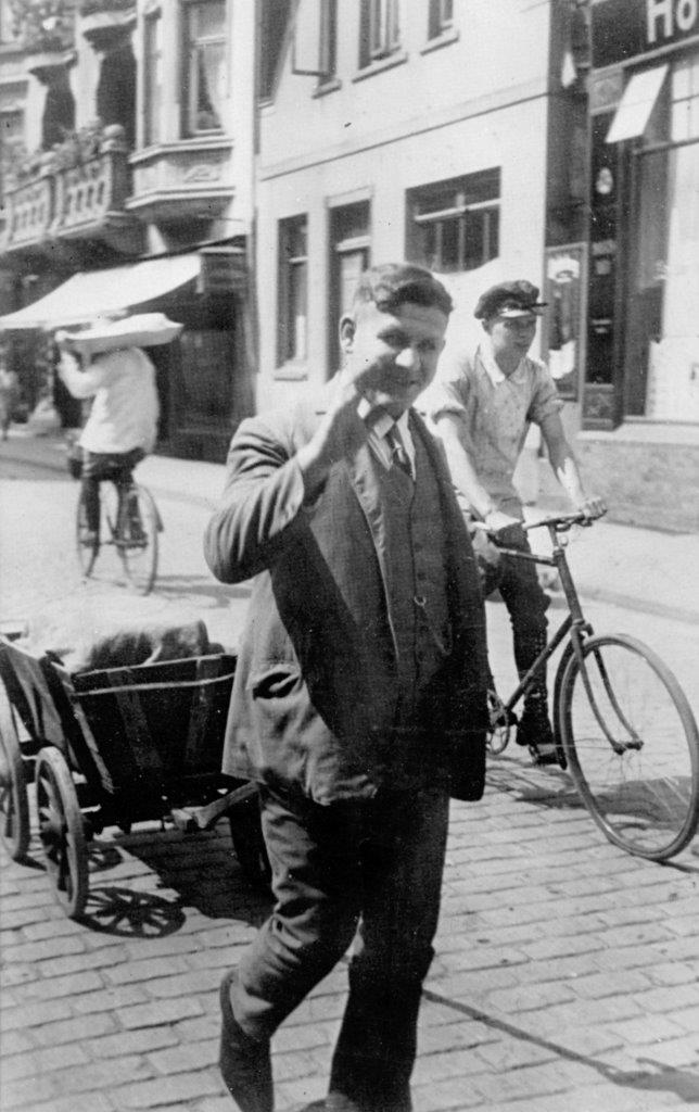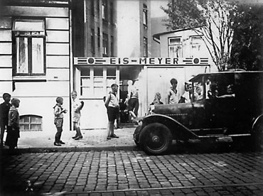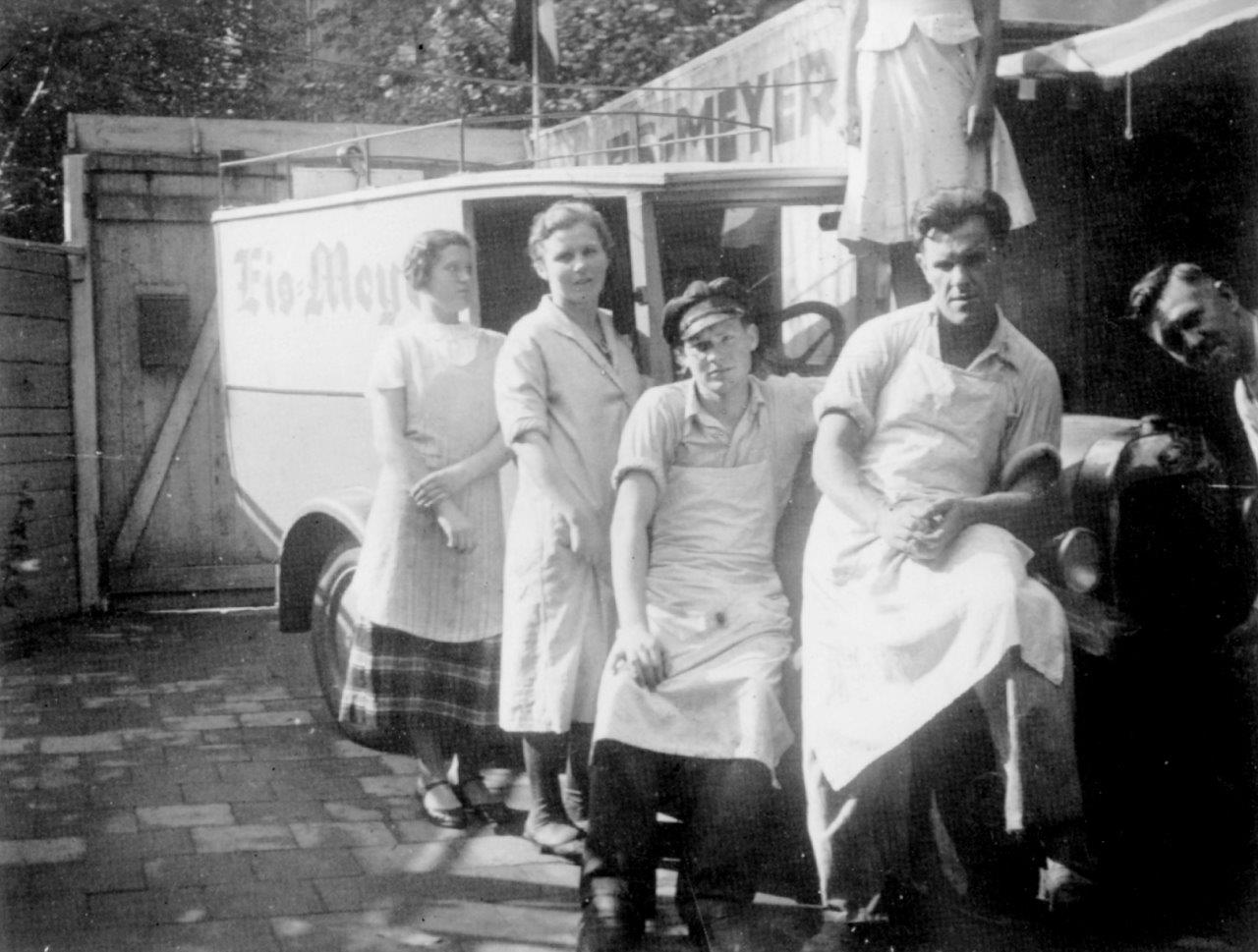 Der Firmengründer, Karl Meyer liefert Ende der 20er, Anfang der 30er Jahre seine Eiscreme von der Produktionsstätte in der Langen Reihe in seine Filiale in Kiel mit dem Handkarren aus. Mit dabei, ein Mitarbeiter auf dem Fahrrad.