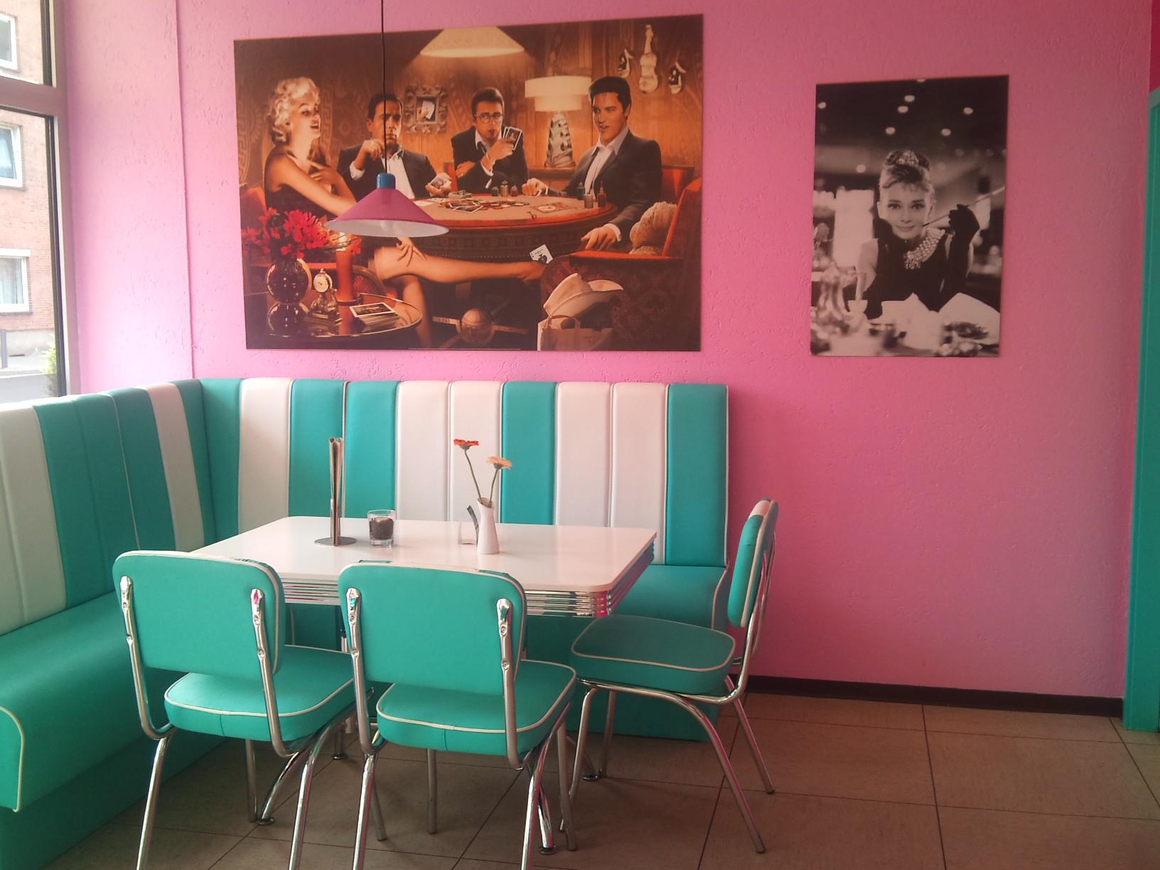 Viel Liebe haben wir für die Ausstattung unseres Eiscafés im Stil eines American Diner der 50er-Jahre aufgebracht. Kommt vorbei und Ihr werdet sie alle entdecken - Betty Boop schaut mit Ihren großen Kulleraugen auf das Geschehen vor dem Eiscafé und begrüßt Euch sozusagen bereits auf der Straße. Beim Eintreten entdeckt Ihr die restliche Bande. Elvis ist anwesend genauso Marilyn und auch ein perfekt gekämmter James Dean glänzt mit Humphrey Bogart um die Wette. Zumindest auf Bildern, die wir im Eiscafé an den Wänden aufgehängt haben.